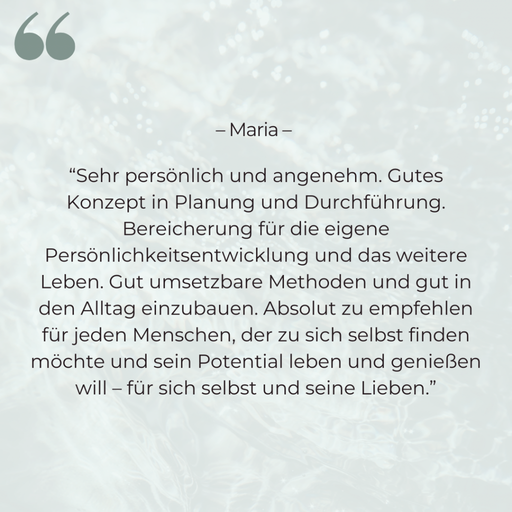 • Sharing Circle für persönlichen Austausch und Raum für Fragen in der Gruppe – in einem vertrauten Kreis von 6 Gleichgesinnten