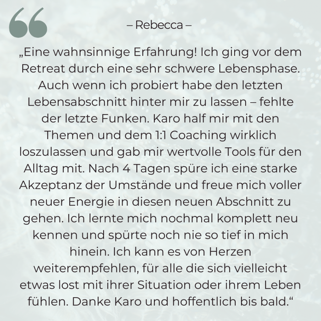 Als zertifizierte Coach und Achtsamkeitstrainerin möchte ich mit dir in diesen vier Tagen einen Raum erschaffen, in dem du wieder mehr bei dir selbst ankommen und deine Seele, Geist und Körper wahrnehmen kannst, sodass Wachstum entsteht. Es dürfen innerliche Veränderungen zum Vorschein kommen und sich neue Perspektiven sowie Sichtweisen entwickeln. Damit du dein Leben inspiriert und aus deiner Mitte heraus leben und erleben kannst.